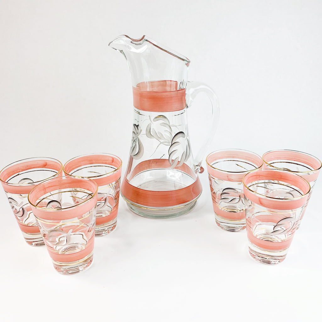 Vintage Hand Painted Pitcher & Glasses w/Gold Trim