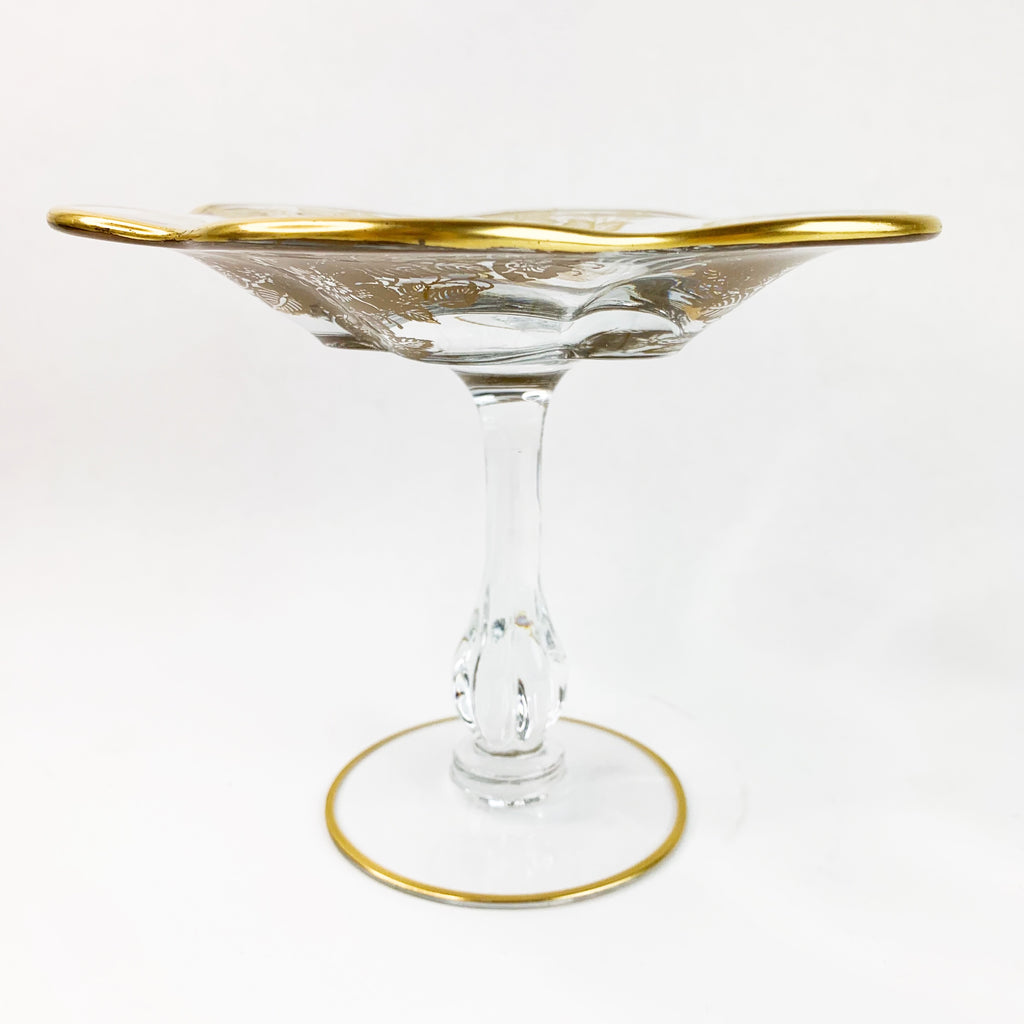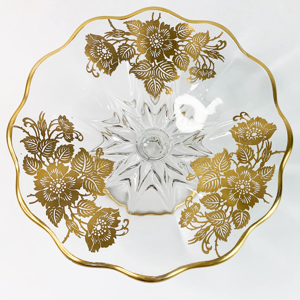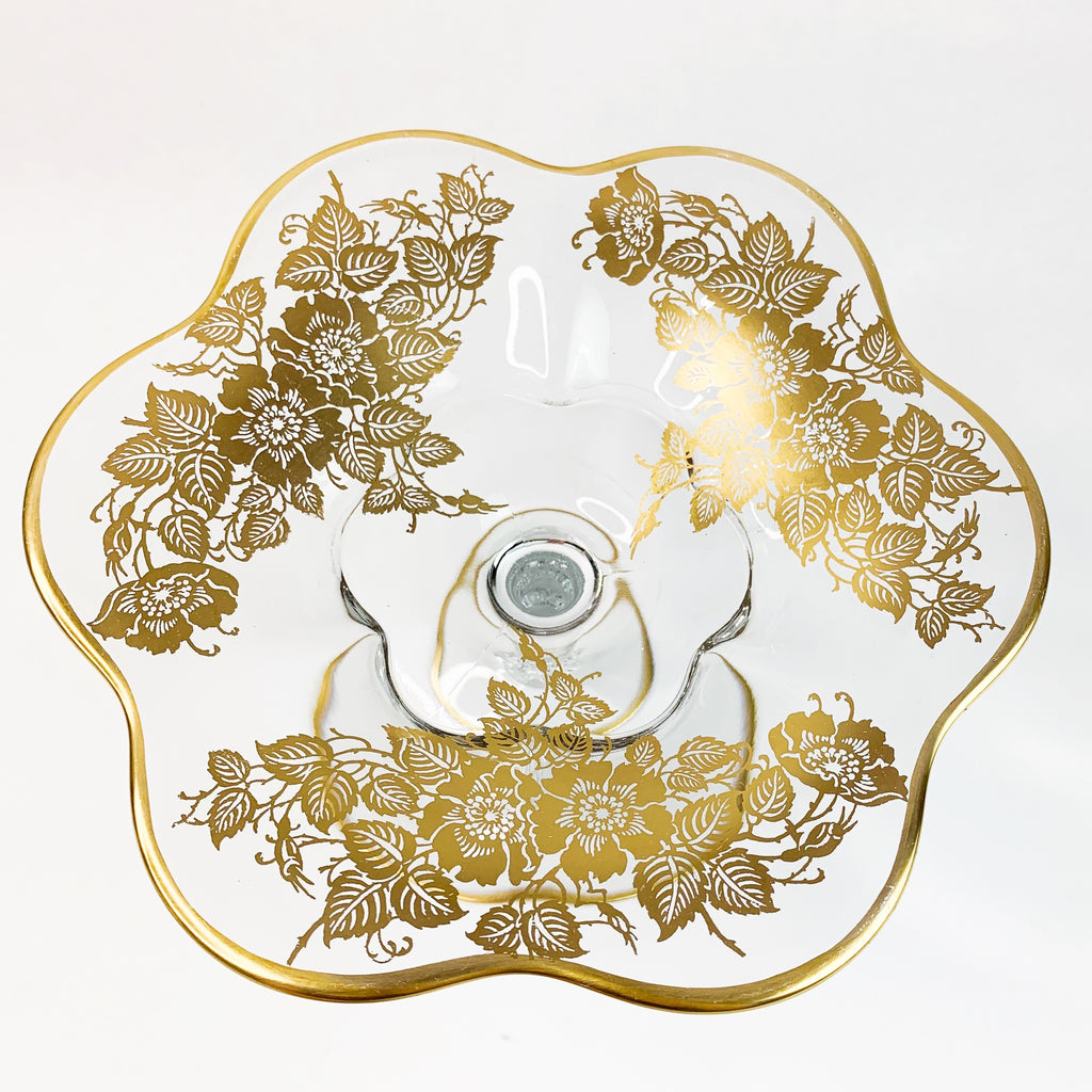 Vintage Footed Glass Floral Gold Scallop Edge Dish