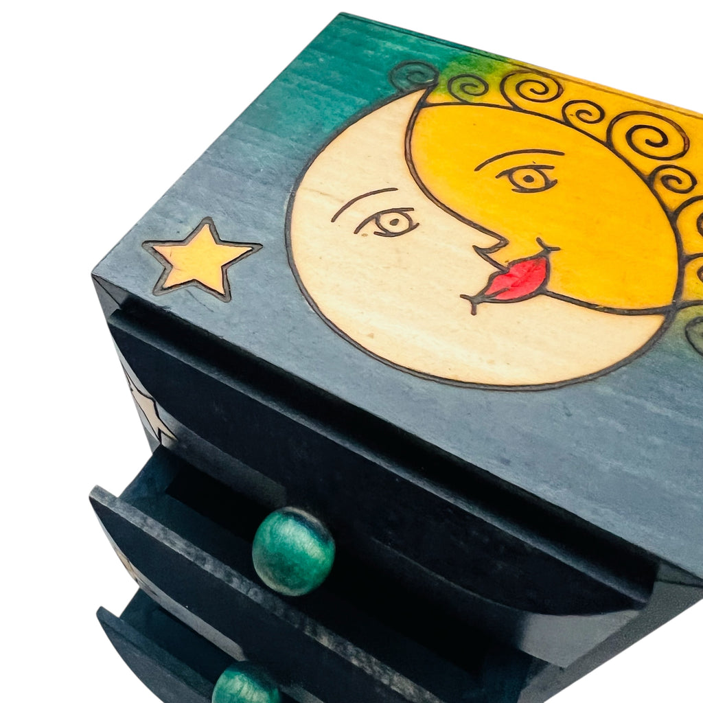 Vintage Sun Moon & Stars Wood Jewelry Trinket Box