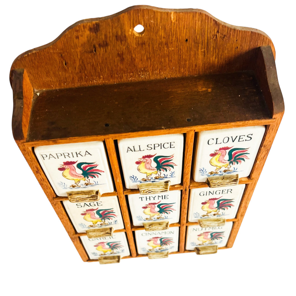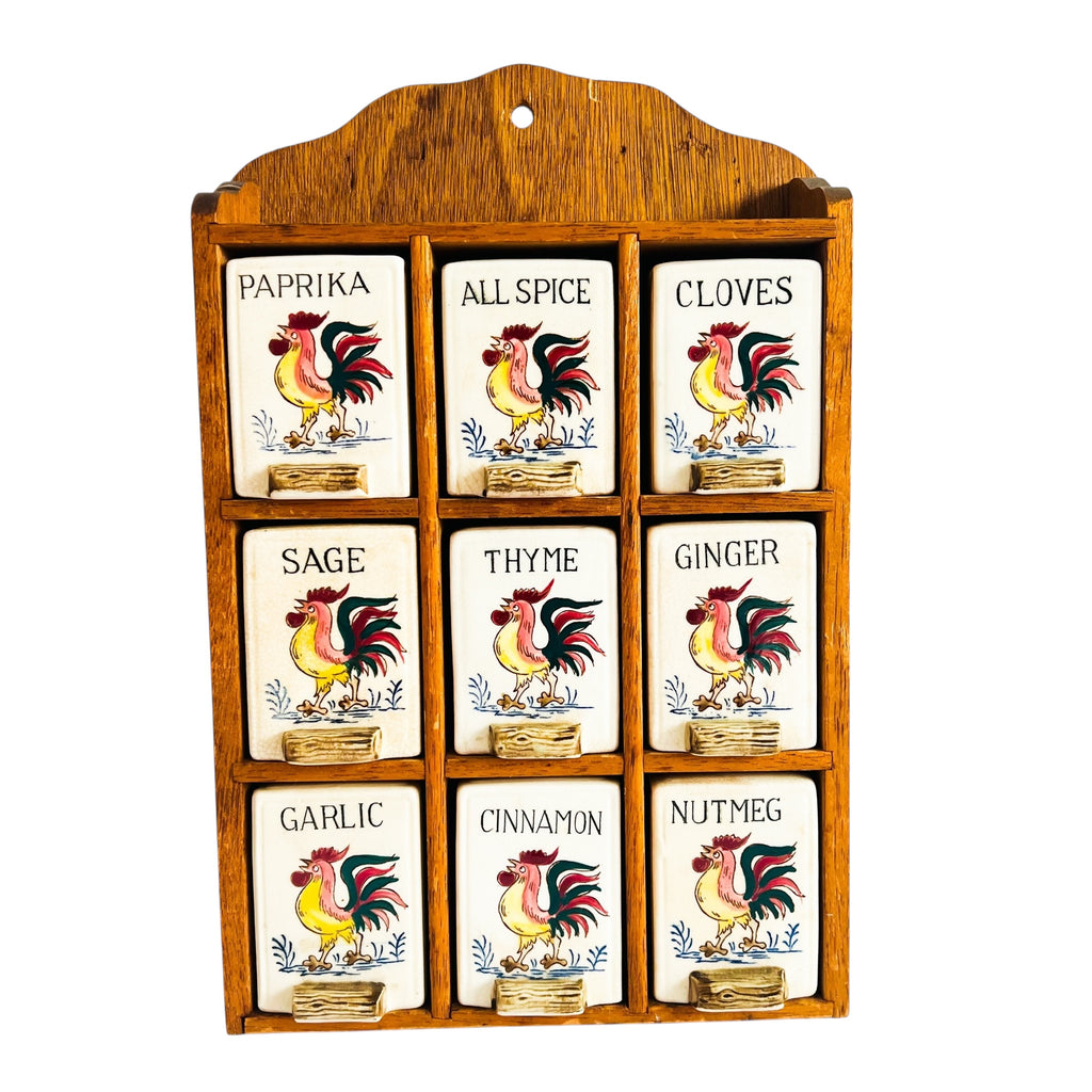 Vintage Fred Roberts Rooster Wooden Ceramic Spice Rack Made in Japan